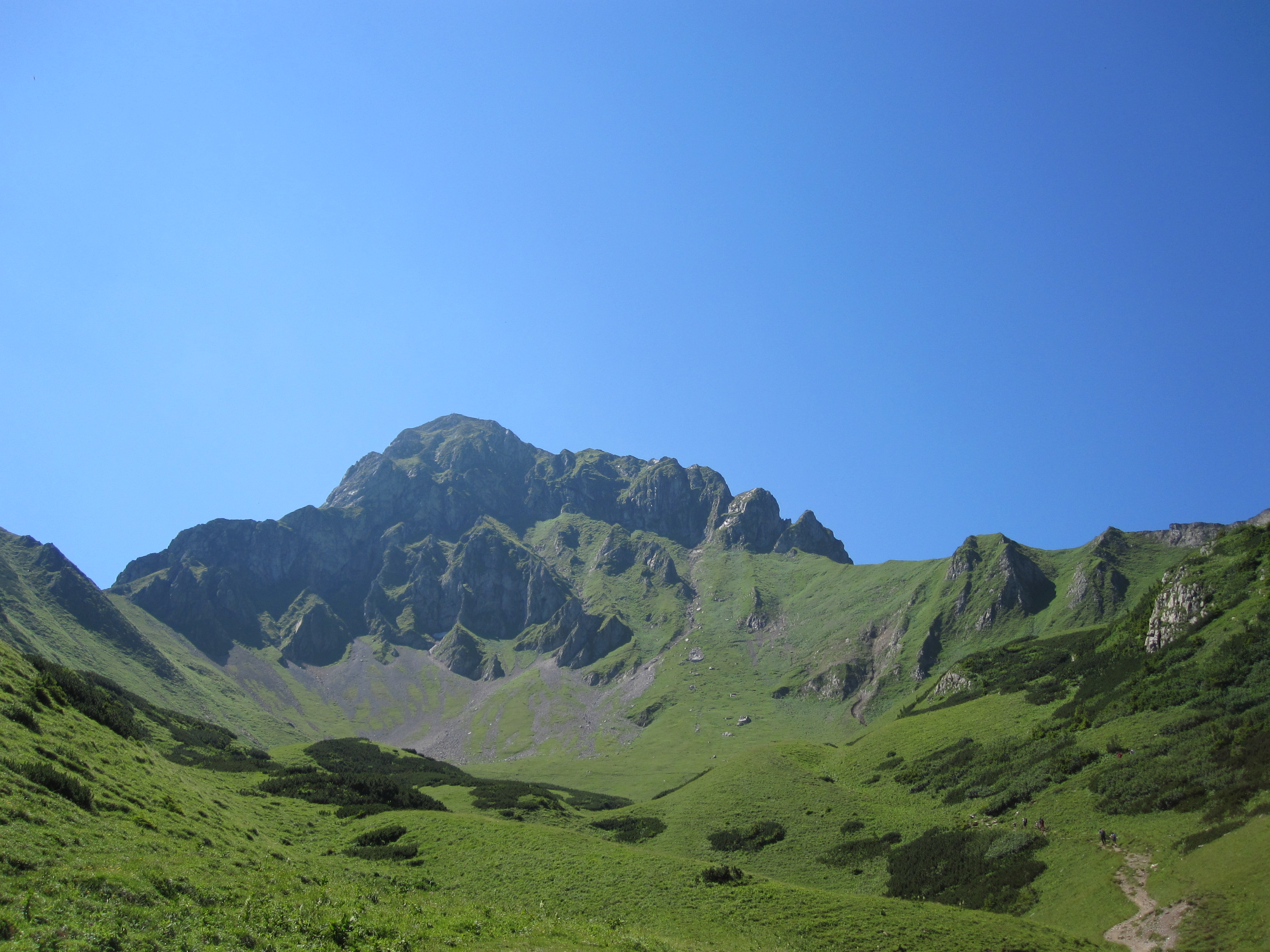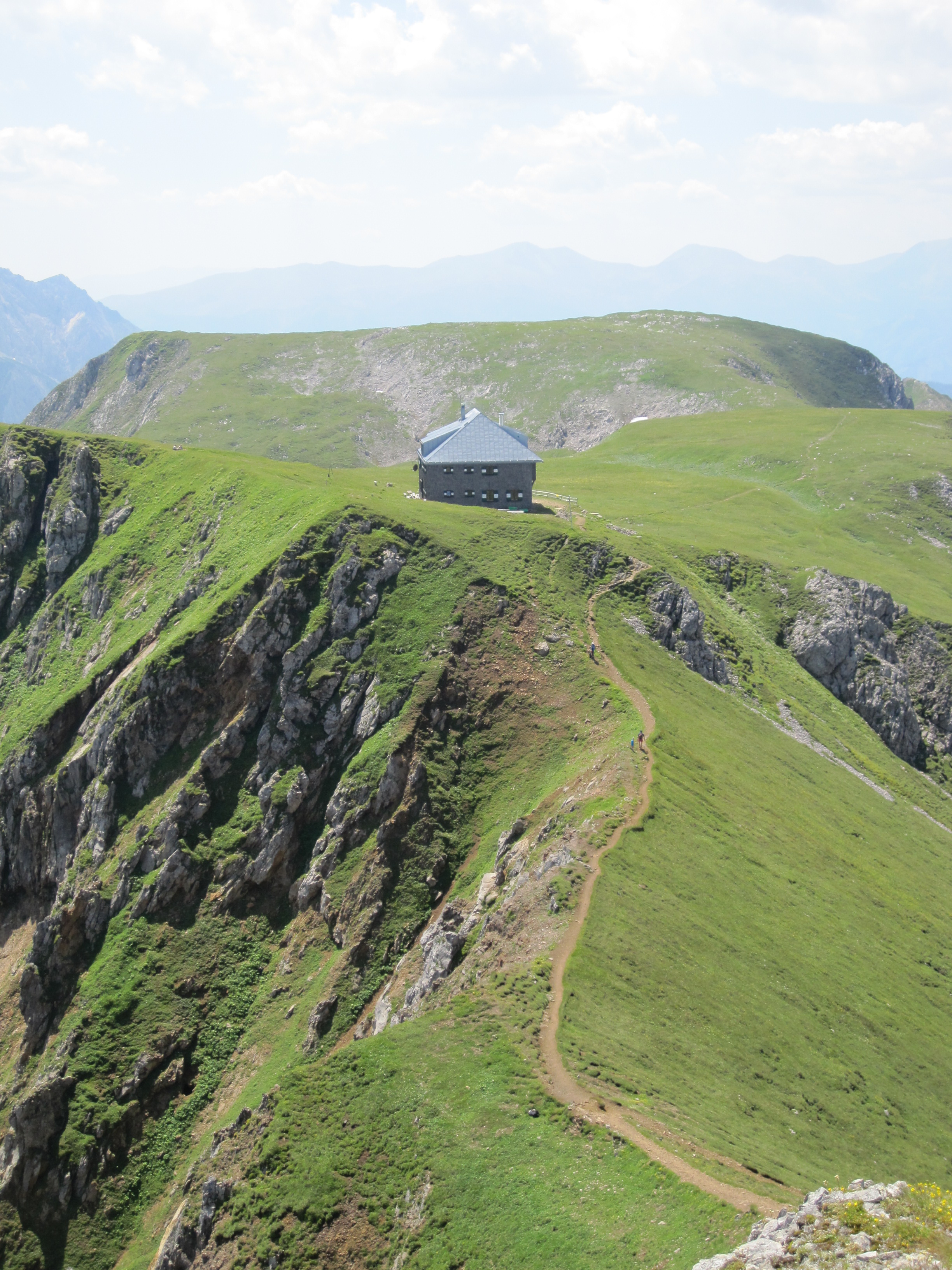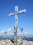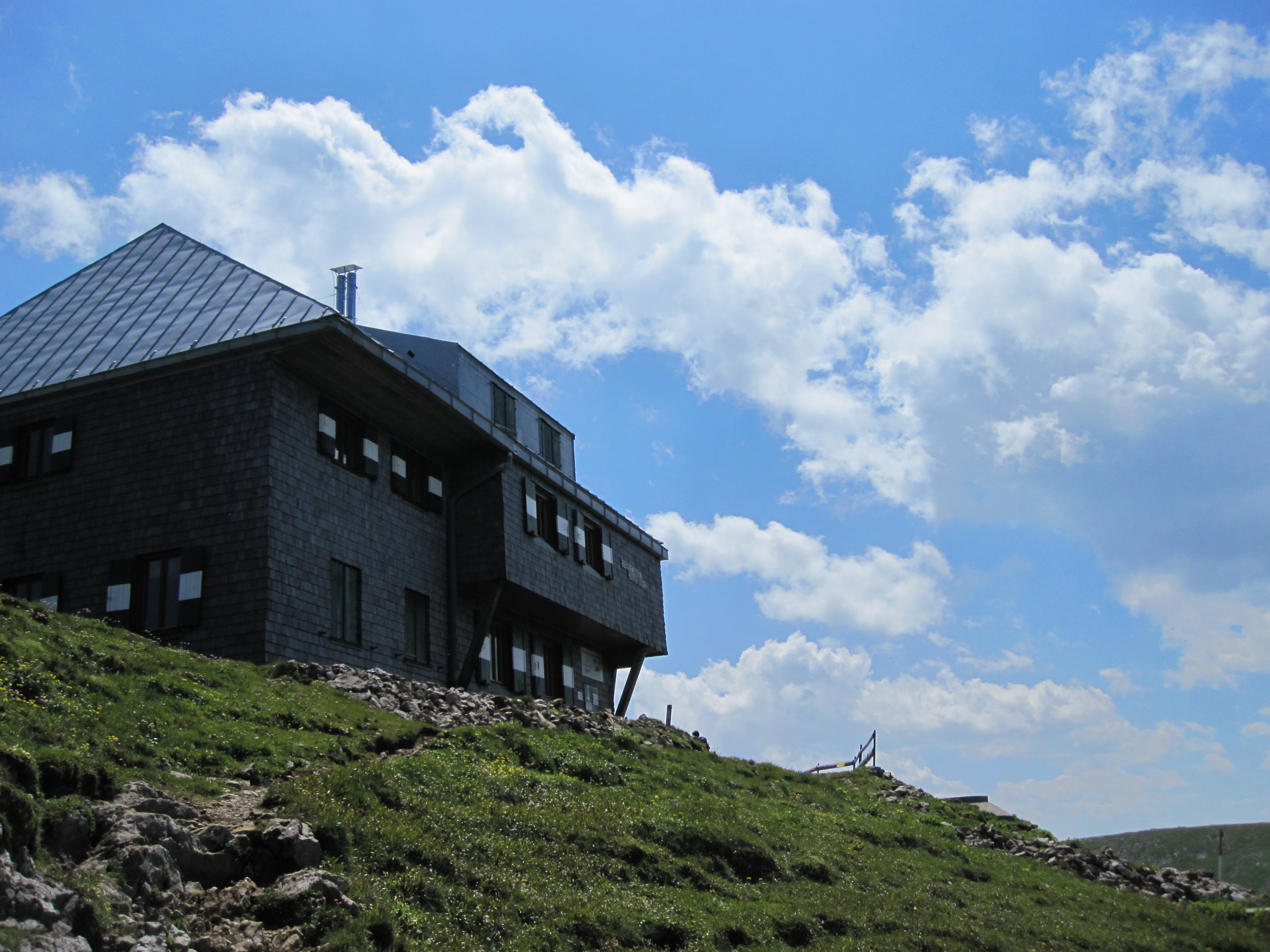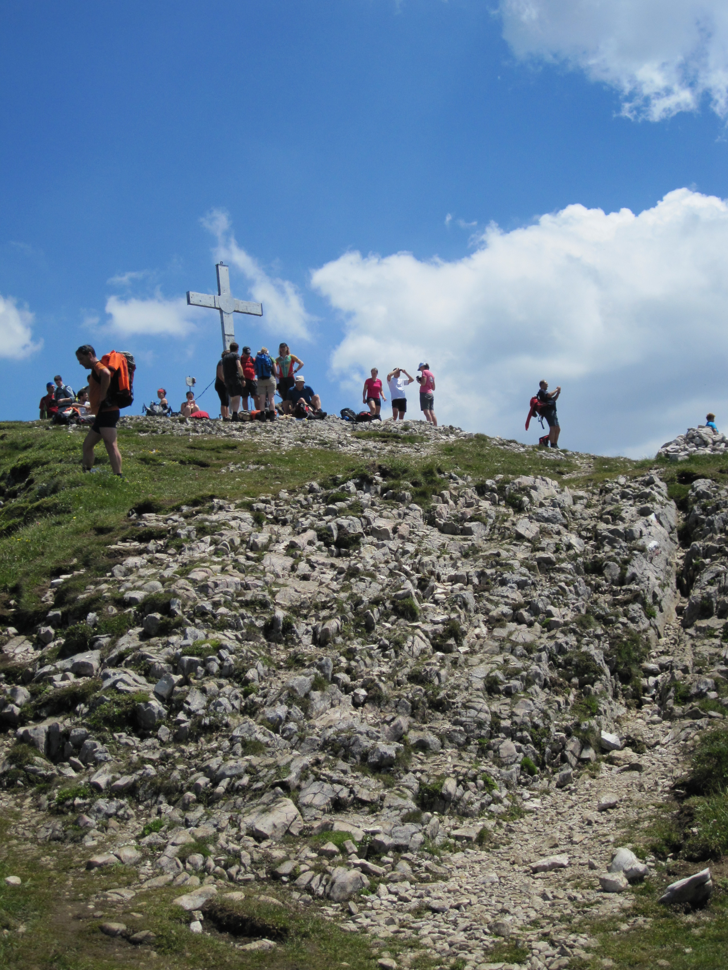 Bald sehen wir über uns die Reichenstein Hütte. Wir wählen den Weg linkerhand, direkt zum Gipfelkreuz. Und quälen uns die letzten Serpentinen im Zick Zack nach oben. Die letzten Schritte zum Kreuz gehen dann fast senkrecht empor. Oben genießen wir mit mindestens 30 anderen WandererInnen – ja, nicht nur wir mögen diesen Berg – ein leichtes Lüftchen bei immer noch 20 Grad auf 2165 m.