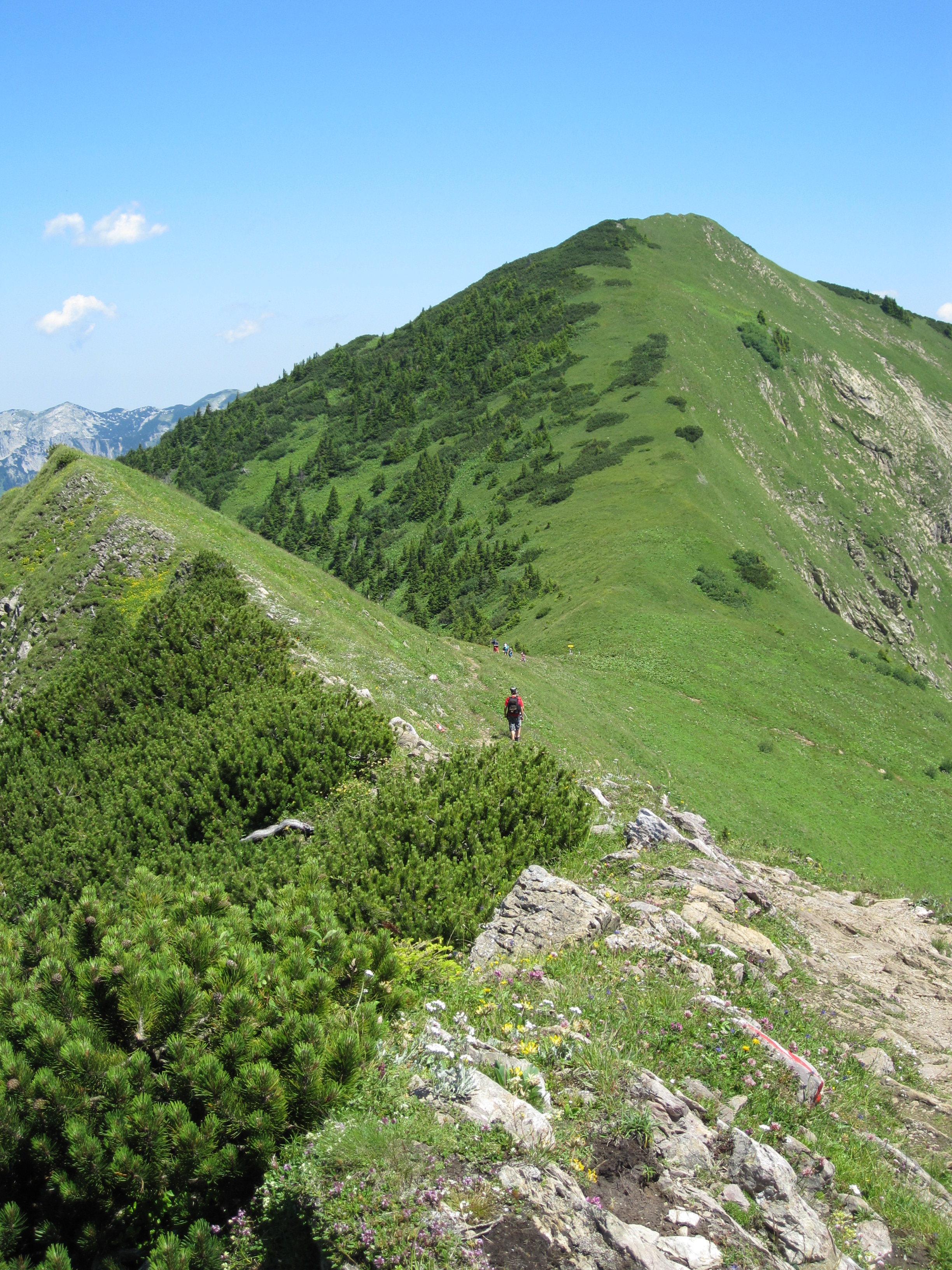 Etwas zu spät für einen hochsommerlichen Tag im Juli marschieren wir vom Präbichler Hof (1260 m) los. Nach einige hundert Metern auf der Lifttrasse zweigt rechts mit einem Drehkreuz markiert der Weg 605 ins Grübl ab, der zügig auf gewundenen Wiesen- und Waldwegen zum Rösselhals führt. Als Variante kann man auch auf der Lifttrasse weitergehen, die linkerhand in einen bequemeren Forstweg übergeht, der wiederum nach dem ersten Anstieg in den Weg 605 mündet.