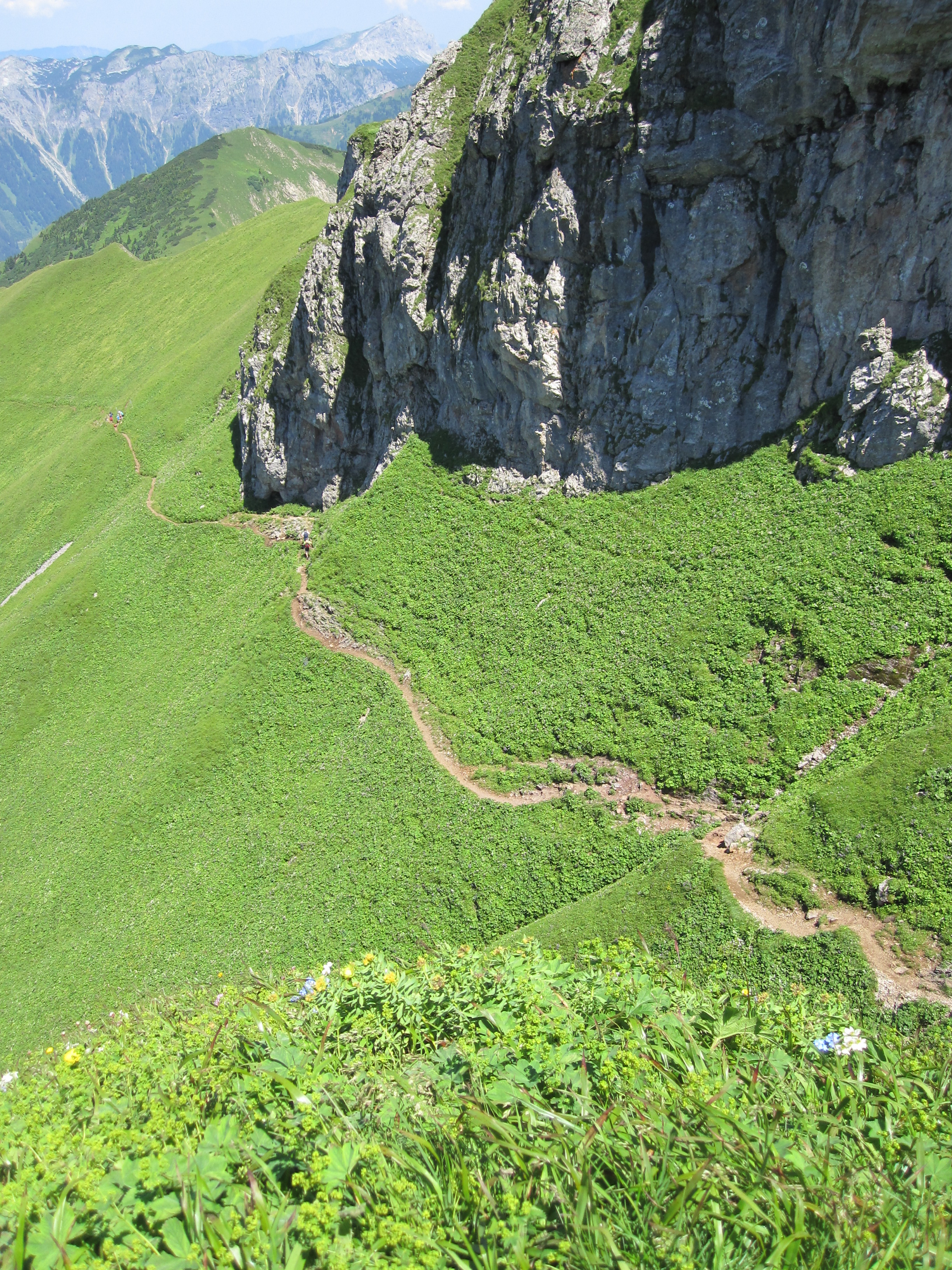 Am Rösselhals angelangt baut sich der massive Zacken des Eisenerzer Reichenstein vor einem auf und weist den Weg. Wir entscheiden uns, auf dem Theklasteig, einem Kammweg den Reichenstein auf der Westseite zu besteigen. Der Weg am Kamm bietet schöne Blicke hinab zum geschundenen Erzberg.