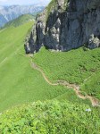 Diesmal steigen wir gleich die Serpentinen direkt bei der Hütte hinunter. Eine Gemse, die das Treiben auf der Hütte von ca. 100 m Entfernung beobachtet, schaut uns nach. Da der Abstieg über die „Stiege“ schneller geht, als über den Normalweg, klettern wir über diese Passage wieder hinunter – was offen gesagt etwas mühsam ist. Für die letzten Meter zum Parkplatz wählen wir dann den bequemeren Abstieg über den Forstweg.