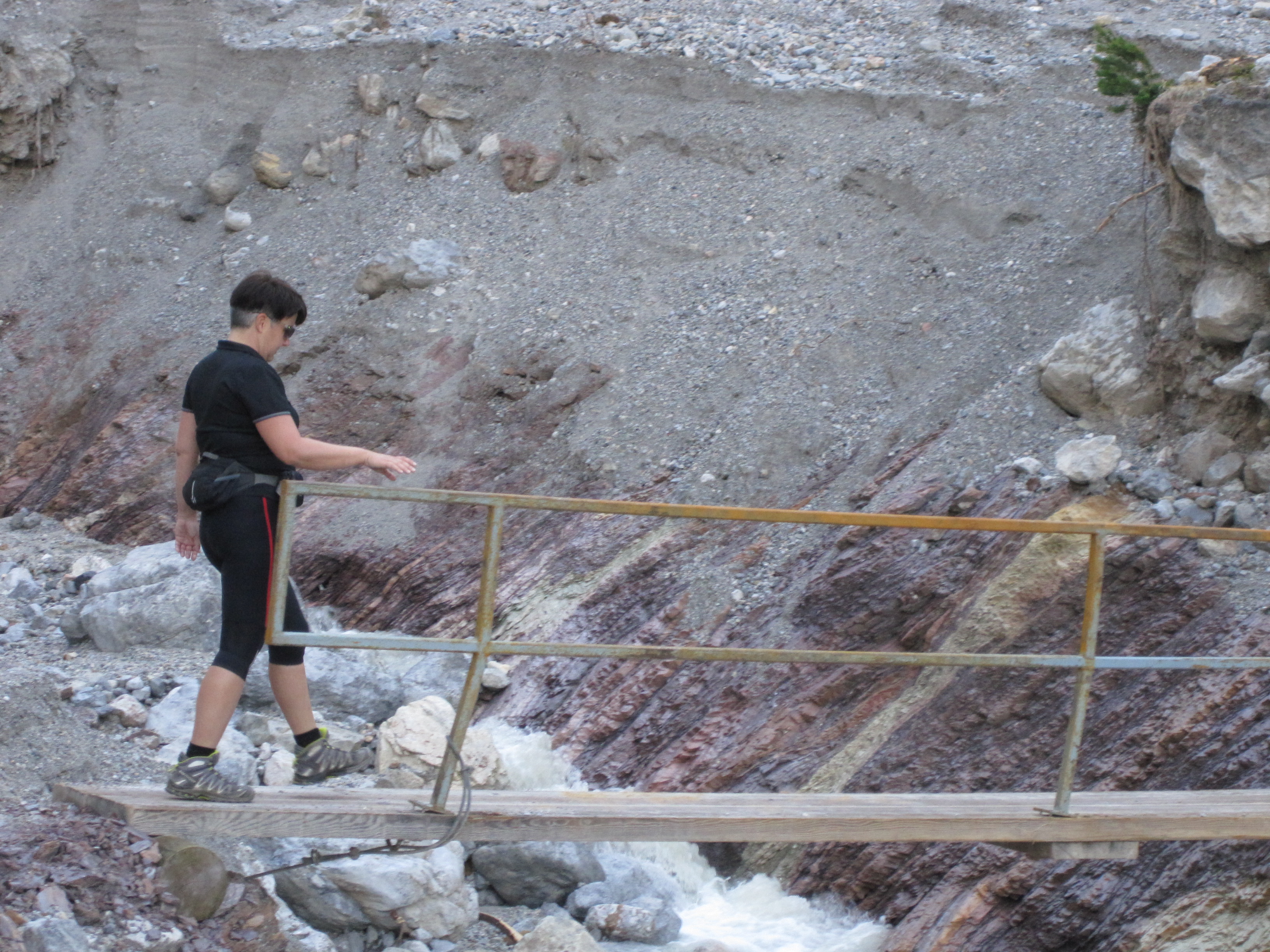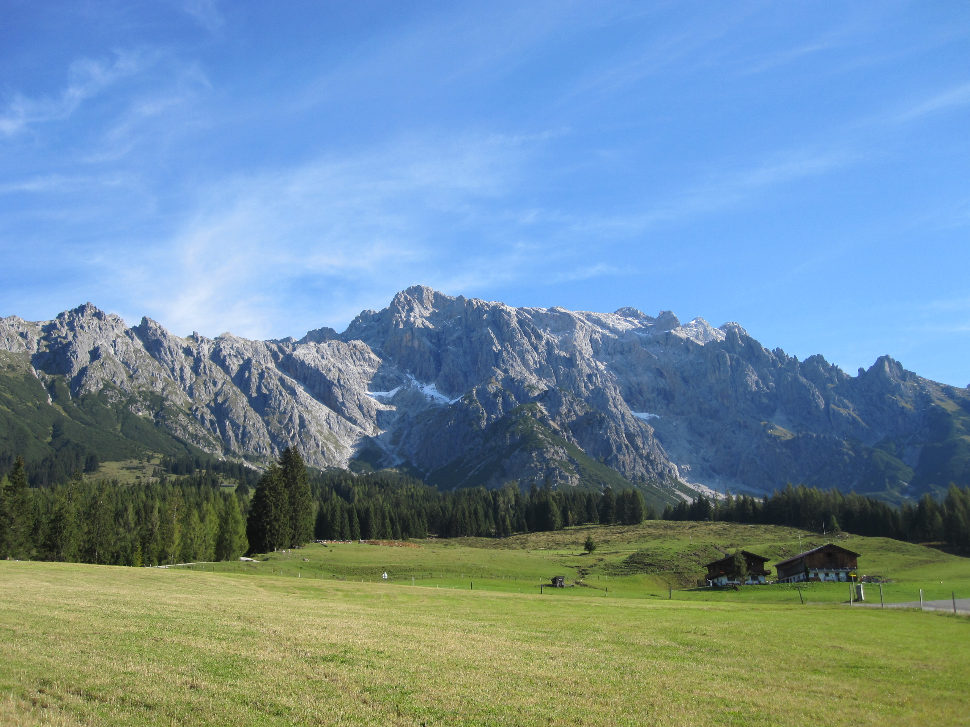 Nach einem kurzen Abstieg erreichen wir dann das Riedlingtal mit einem Wasserfall und den Mandlwänden im Hintergrund. Wir gehen an den natürlichen Schisprungschanzen vorbei, die bis in die 1990er Jahre als Trainigszentrum dienten. Kurz vor der Windrauchegg Alm zweigen wir links auf den Weg 36 ab und gehen flach dahin zum Arthurhaus (1590m). Das Arthurhaus bietet eine Vielzahl an Freizeitaktivitäten an und ist mit Bussen leicht erreichbar, daher treffen wir hier auf einen eher für die Sommermonate in dieser Region untypischen Rummel. Nun haben wir die Möglichkeit auf dem Mitterberger Erzweg (Weg 85) in den Ort Mühlbach am Hochkönig abzusteigen (rund 2,5 Stunden Gehzeit) oder mit dem Wanderbus in den Ort zu fahren. Wir nehmen den Bus.