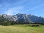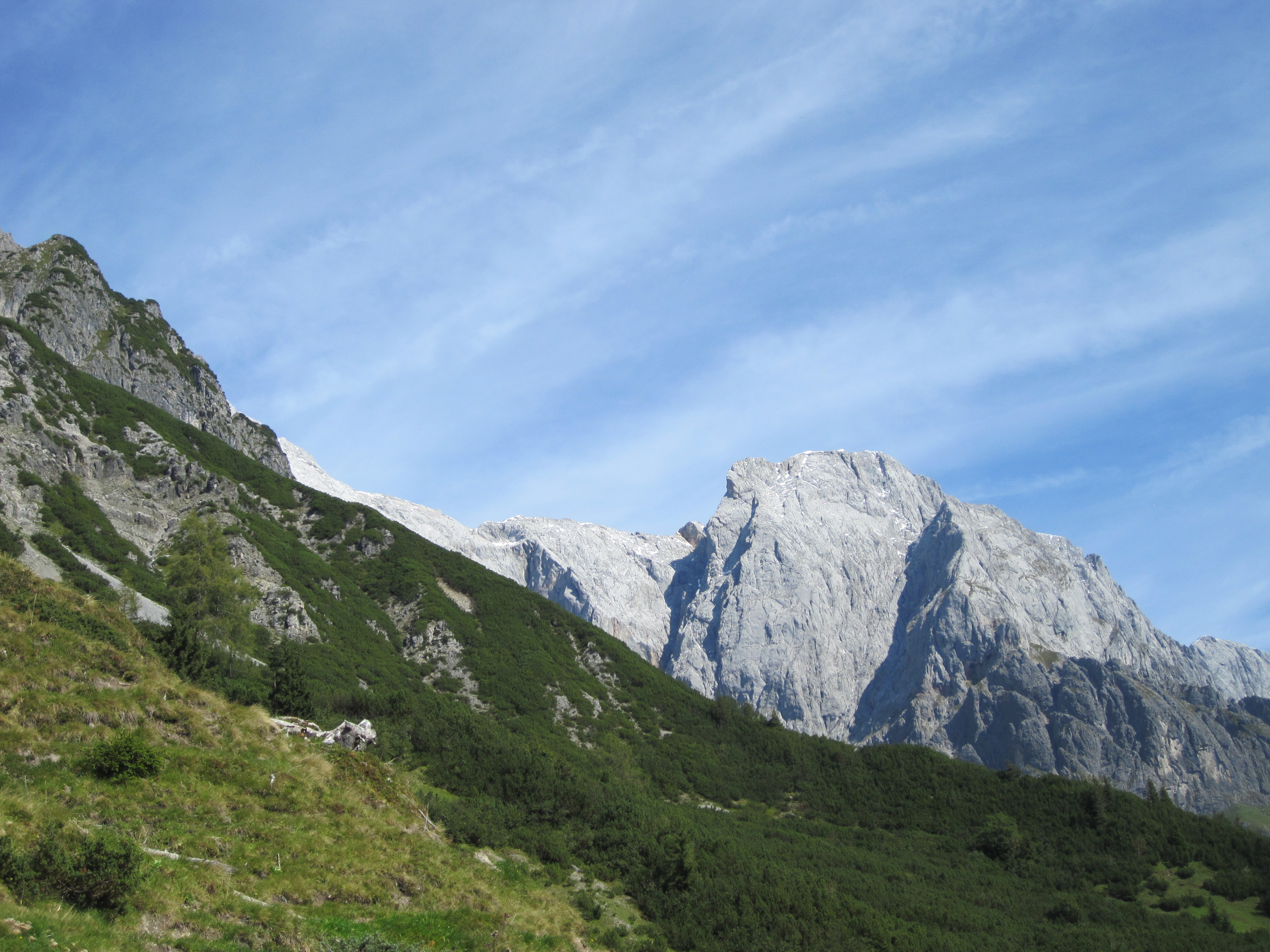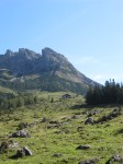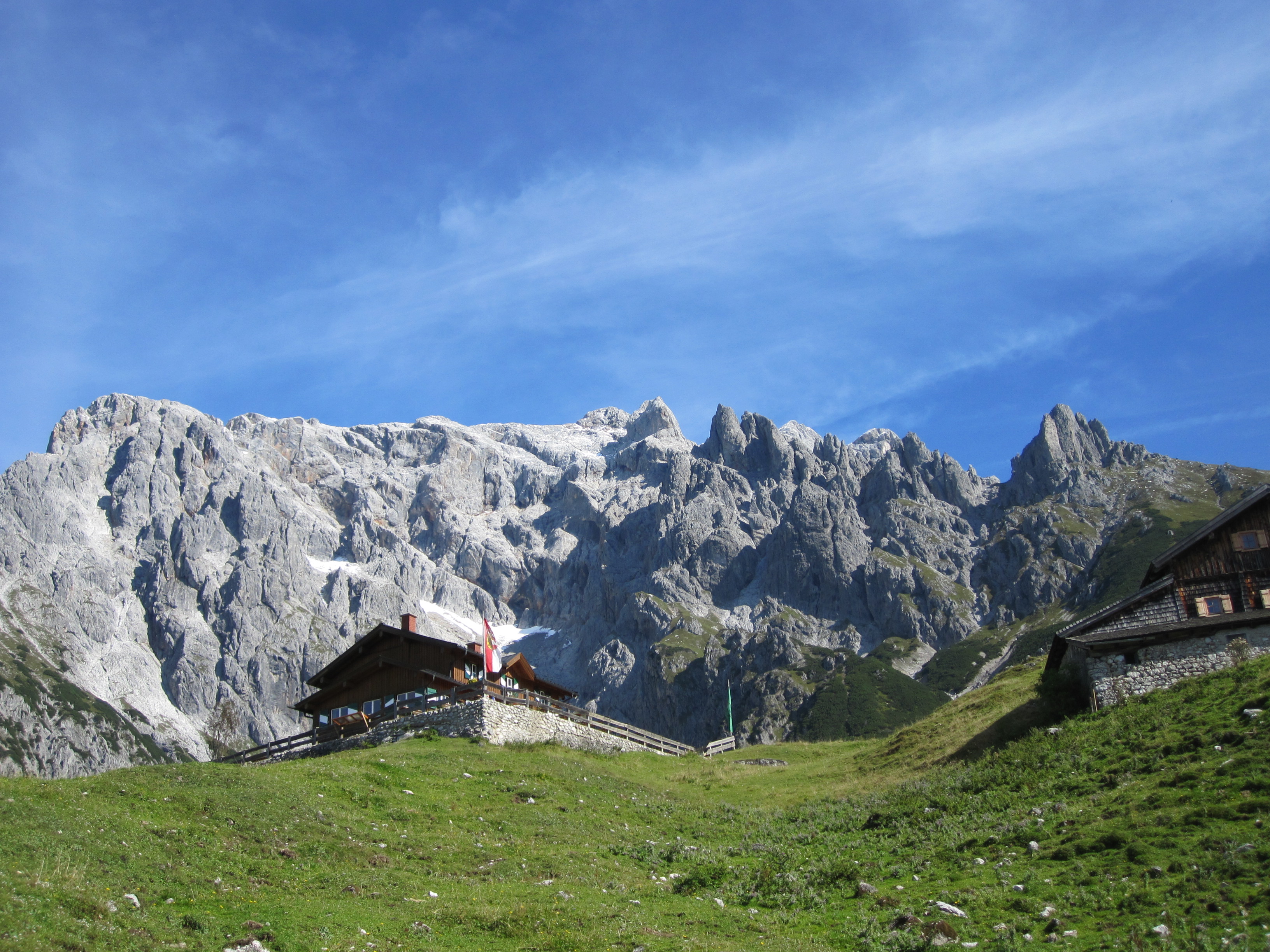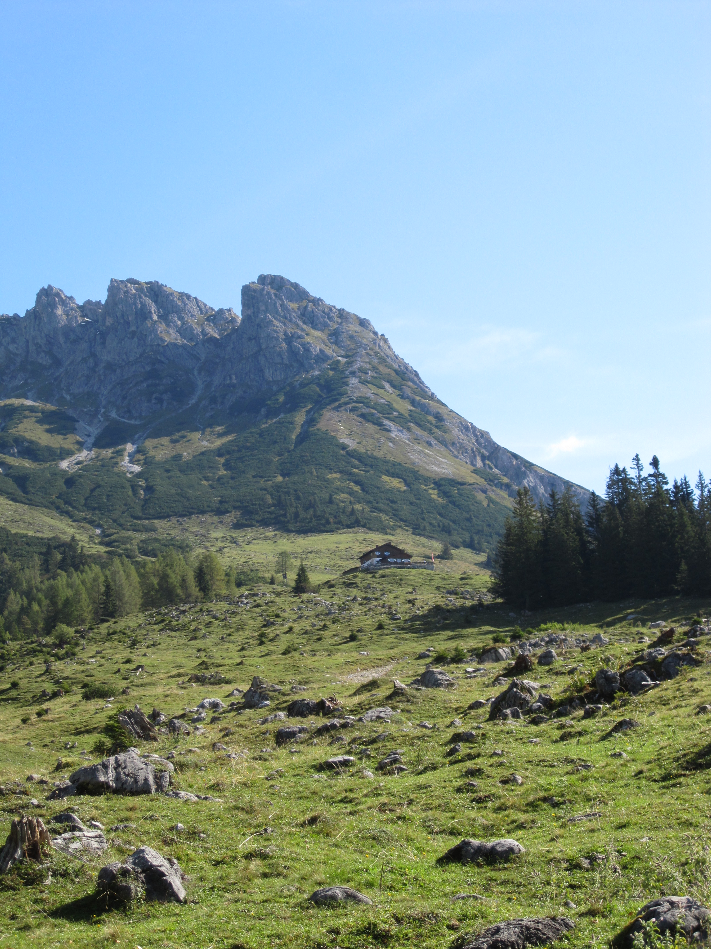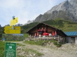 Endlich am Startpunkt angelangt, gehen wir auf dem Weg 66 zuerst über Almen und dann über Waldwege, vorbei an Murenabgängen und Wildwasser-Schluchten zur Erichhütte (1546m). Hier befinden wir uns direkt am Fuße des Hochkönigs und am Ausgangspunkt vieler Bergtouren. Wir haben hier auch schon den größten Anstieg hinter uns. Auf gleichbleibende Höhe wandern wir durch Latschen-Felder vorbei an der Abzweigung zur Stegmoos-Alm bis ins Birgkar. Bald treffen wir auf immer mehr Wanderer, ein sicheres Zeichen, dass wir die „Vier-Hütten“ bald erreicht haben. Die „Vier-Hütten“ sind ein beliebtes Wanderziel vom Arthurhaus aus. Nach eineinhalb Stunden relativ gemütlichen Gehens gelangen wir dann zu den „Vier Hütten“ (1542m).