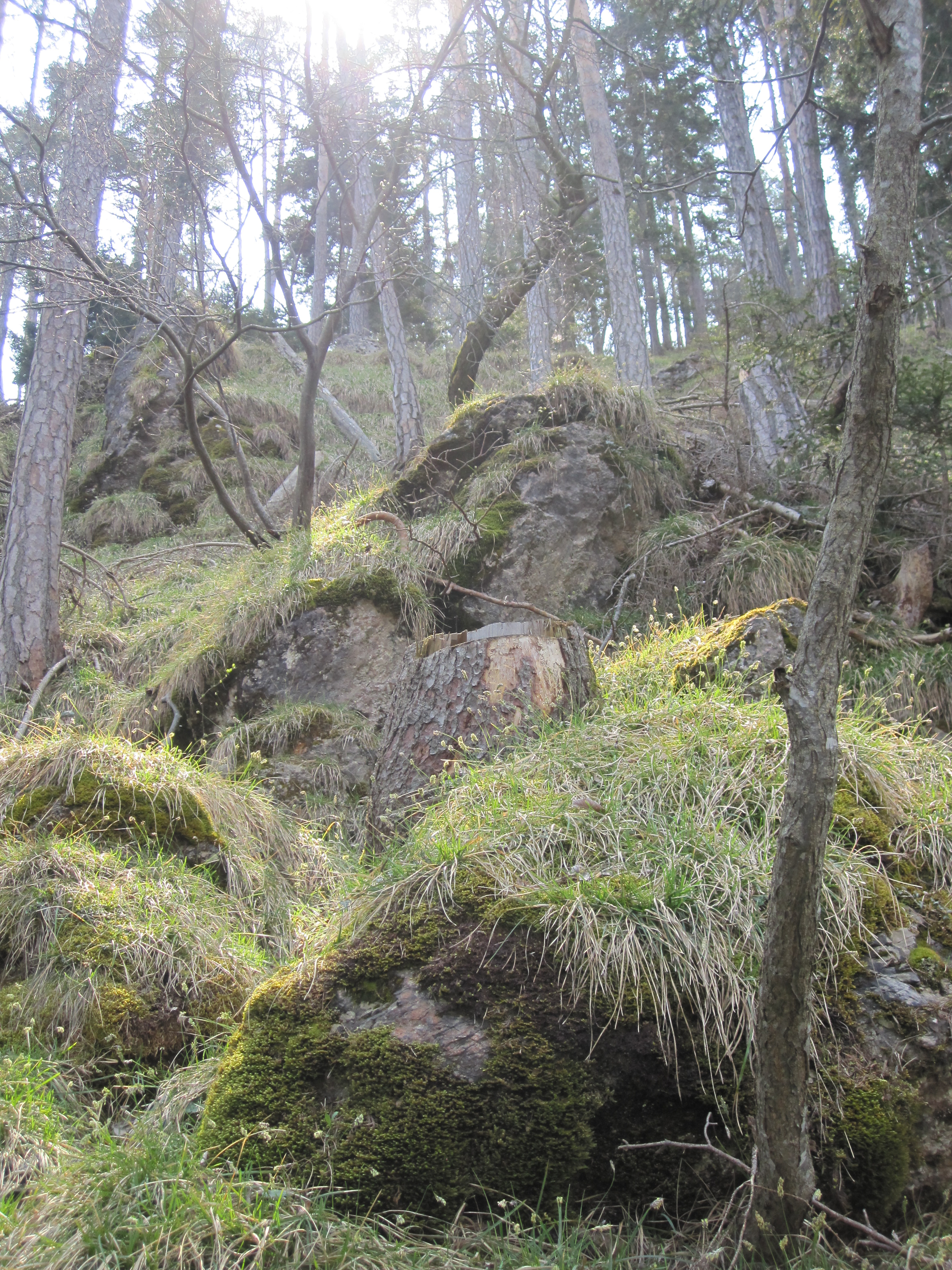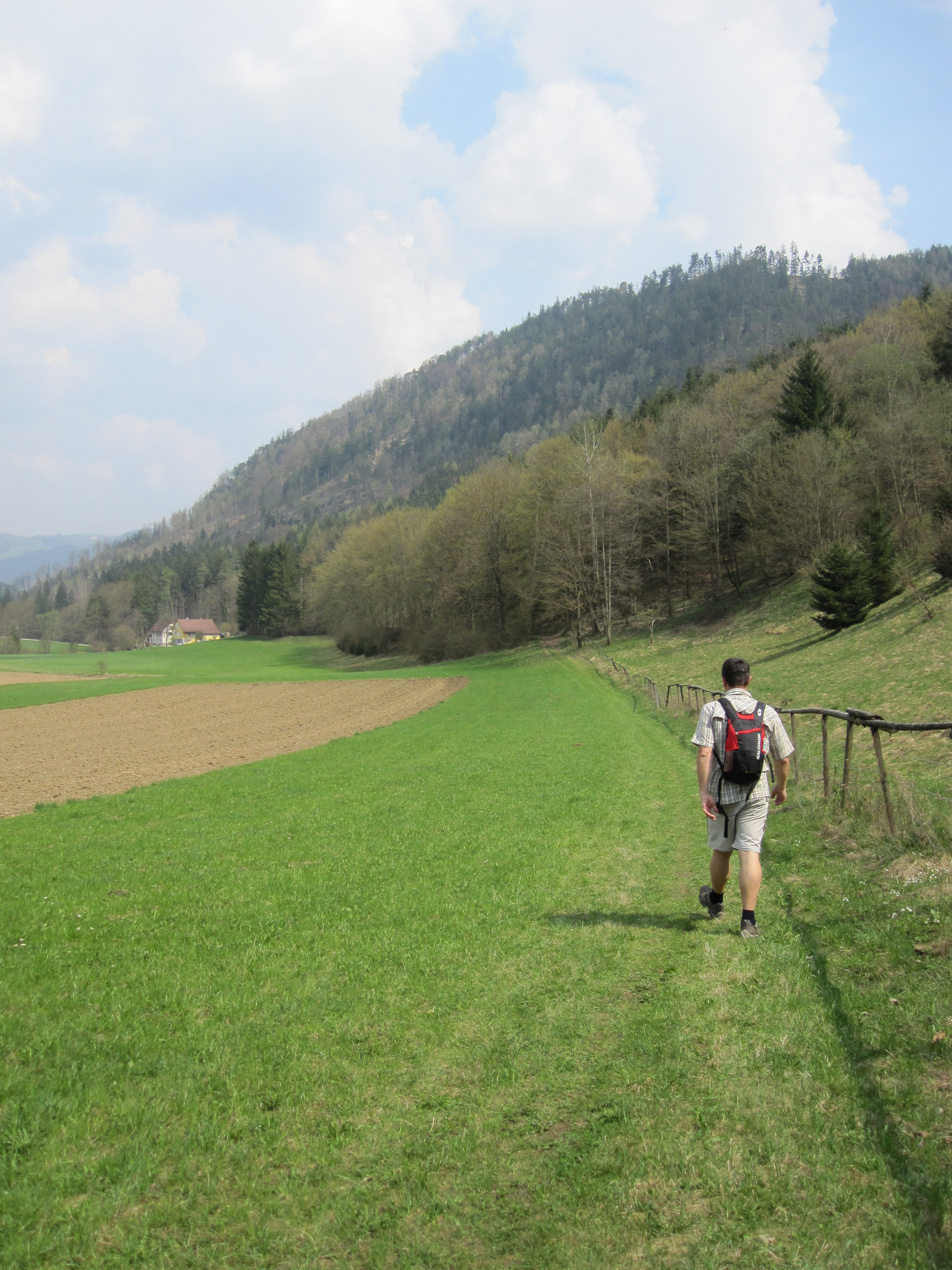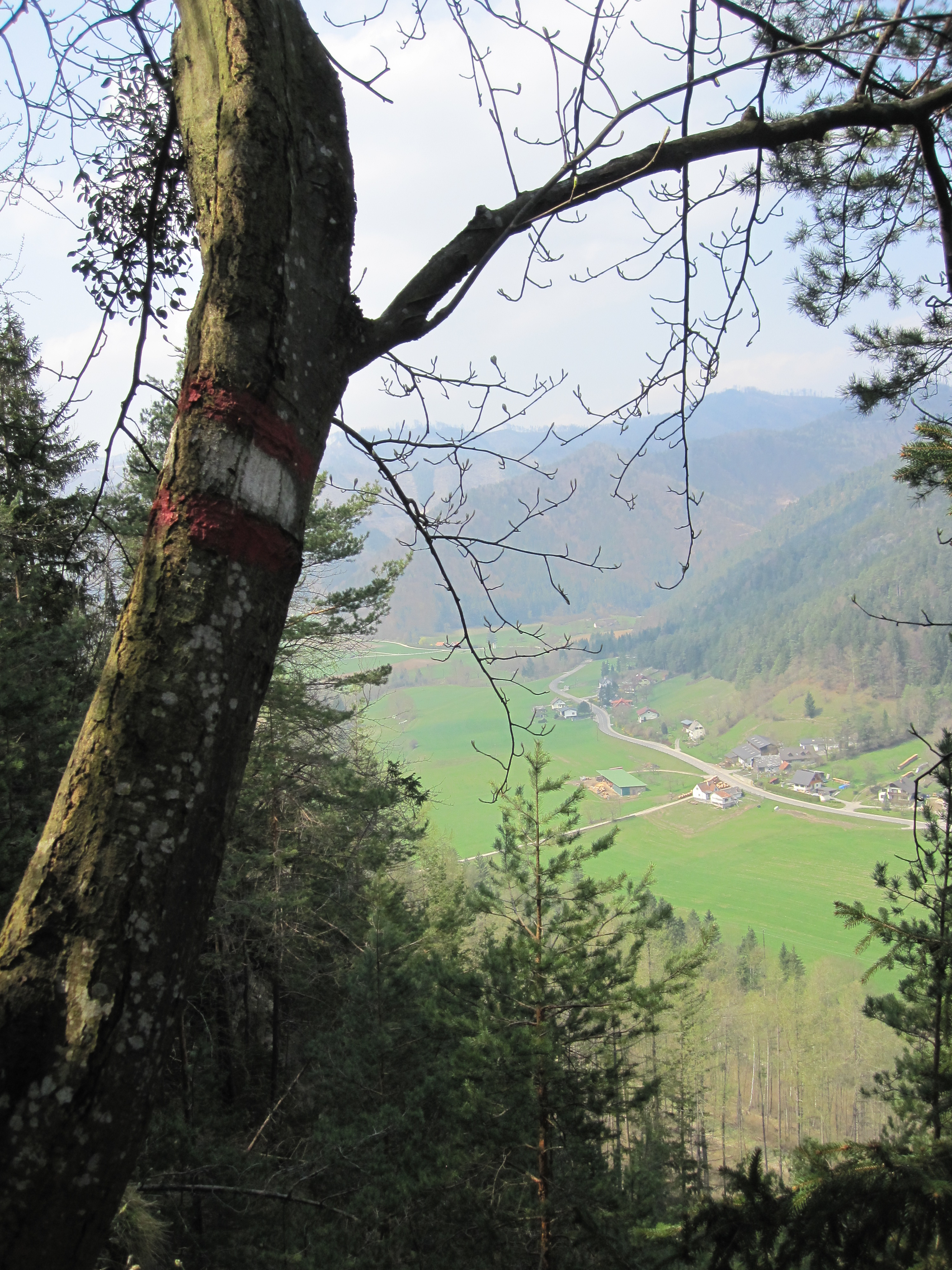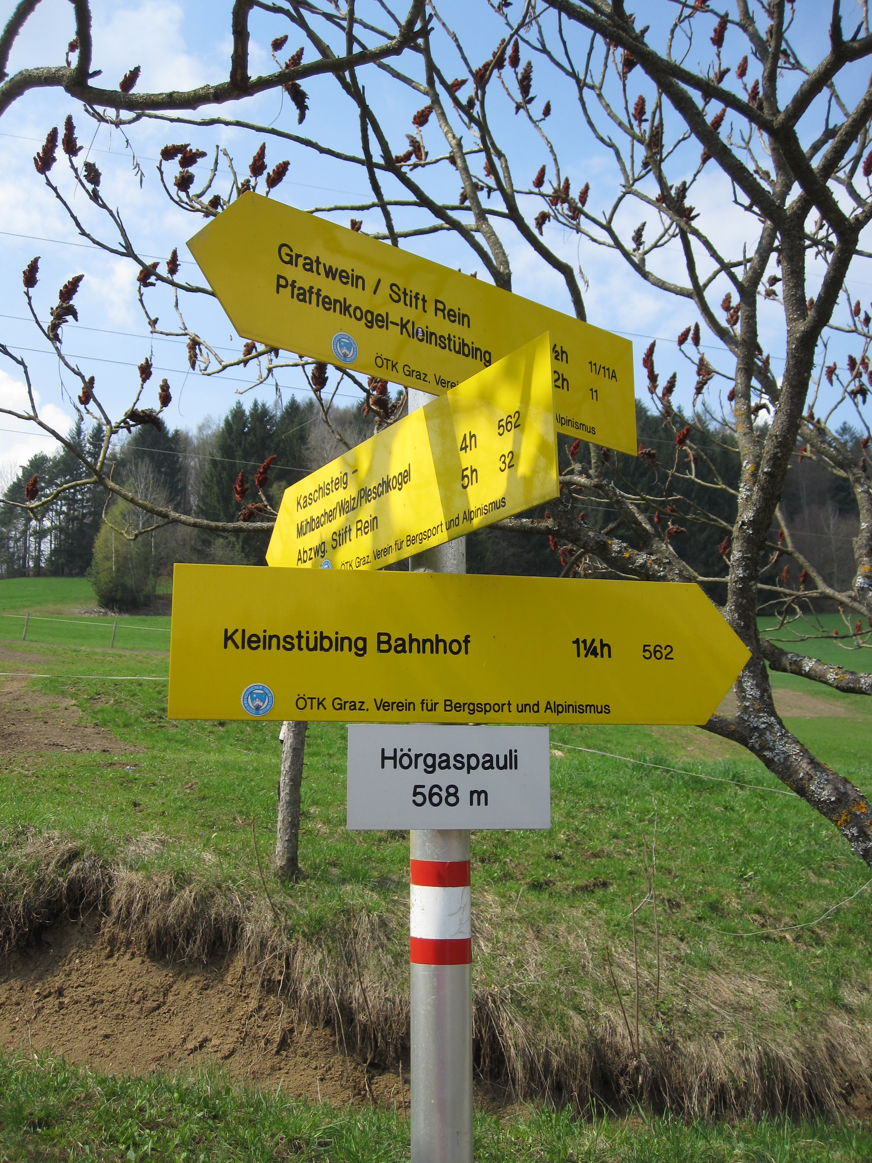 Von da an fällt es stetig bis wir an eine Asphaltstraße gelangen, der zur Mostschenke Hörgaspauli (568 m) führt. Von da an geht es wieder durch den Wald bis sich das Gelände öffnet und wir nach rechts in den Stübinggraben einschwenken. Dort geht es auf Wiesen vorbei an Gehöften bis wir den Stübingbach erreichen. Dem folgen wir bis zur ersten Abzweigung und gehen dann zurück zum Parkplatz.