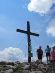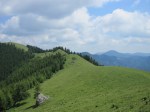 Recht steil durch den Wald, vorbei an der Abzweigung zur Drachenhöhle und später zum Frohnleitner Höhenweg, trifft man nach ca. 1,5 Stunden oder 600 Höhenmetern auf eine Forststraße, die rechts vom Rote Wand-Parkplatz kommt. Nun kann man wählen zwischen dem direkten Anstieg auf den Gipfel der Roten Wand (Weg 747 links) und dem Weg 748 unter der Roten Wand zur Tyrnauer Alm. Ich möchte zuerst auf die Rote Wand, also halte ich mich links und gelange zur Wiese auf der Bucheben (1081 m). Rechts steigt dann der Weg sehr steil durch Wald, vorbei an Felsabstürzen und Wiesenhängen zum eingezäunten Gipfel der Roten Wand (1505 m).