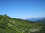 Vom Karlspitz kann man auf den Schreinl (2154 m) oder auf die Schoberspitze (2126 m) weiterwandern. Wir möchten weiter auf die Schoberspitze und steigen also in die Karl-Scharte (1940 m) ab. Rechterhand haben wir Blick auf ein Hochplateau, das von Gletschern geformt wurde und auf die beiden Karlseen. Von nun an geht es steil auf Wiesen bergan. Die Rast auf der Spitze des Schobers ist nicht empfehlenswert, da Schafe den Berggipfel als Ort für ihre Notdurft erwählt haben und einen länger als wenige Minuten dauernden Aufenthalt nicht zulasst. Warum die Schoberspitze der „verschissenste“ Berggipfel der Alpen ist (O-Ton Mitwanderer) können sich auch Einheimische nicht erklären.