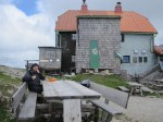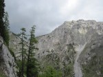 Der Weg führt uns zunächst durch Wald bis sich das Gelände öffnet und wir durch schütteren Bewuchs einen Pfad neben einer Schneerinne aufsteigen. Da der Weg recht kurz ist, muss mit jedem Schritt Höhe gemacht werden. Auf ca. 1350 m führt links eine Abzweigung in den Blarergraben, durch den ein Steig teils extrem steil direkt zum Schneealpehaus führt. Zuletzt geht es noch über ein Schneefeld und schon sieht man das Schneealpenhaus, 1784 m, was auch gut ist, denn mittlerweile hat es zu graupeln begonnen.