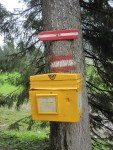Wir marschieren also wieder auf der Forststraße bis zur Jagdhütte Eisernes Törl, 1346 m. An diesem Punkt liegen die meisten Höhenmeter hinter uns und es geht recht gemächlich auf einem Pfad über Almböden und Wald bergan. Bei der Weggabelung halten wir uns links und gehen am Unteren Haselboden am Postkasten vorbei, von dort folgen wir wieder der Forststraße bis zum Oberen Haselboden.