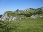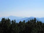Zuerst geht es durch schütteren Wald, dann über weites Almgelände und durch kleine wie Fraktale aussehende Latschengruppen. Immer wieder können wir linkerhand Blicke auf den Hochschwab werfen. Bald sehen wir den Großen Feistringstein, der östlichste Gipfel einer Felswand.