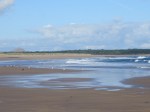 Wir beschließen das Endstück des John Muir Weges nachzuholen und gehen durch die High Street von Dunbar zum Leisure Pool, wo in der Nähe der Ruinen des Castles der Weg endet. An den Klippen von Dunbar gehen wir auf dem Clifftop Trail in Richtung Westen, bis wir die Belhaven Bay sehen können. Dort passieren wir einen Golfplatz. Ab hier befinden wir uns im John Muir Country Park. Am Beginn der Sands steht eine Brücke über einen kleinen Meeresarm, der auch bei Ebbe nicht zu Fuß zu überqueren ist. Wie überhaupt die Sands am besten nur bei Ebbe zu begehen sind, da man bei beginnender Flut leicht vom Festland abgeschnitten werden kann.