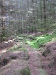 Kurz nach der Abzweigung nach Gartocharn geht es dann los mit unserem Abenteuer. Der offizielle Weg führt an einer Kreuzung nach links, wir gehen aber geradeaus weiter. Danach müssen wir noch rund 2 km auf schmalen Straßen bis zum letzten Haus. Unter einer Hochspannungsleitung durch (gelbe Sicherheitsabsperrung) und dann auf einer Forststrasse durch eine Baumpflanzung bis zu einer langen Rechtskurve. Genau in der Kurve zweigt links in eine Feuerschneise unser Weg ab. „Weg“ stellt sich als sehr übertrieben heraus, aber die Richtung durch den Wald zum Burncrooks Reservoir soll mit weißen Bändern markiert sein. Ist er auch, aber nur drei Bänder lang, dann war kein Band mehr zu sehen.