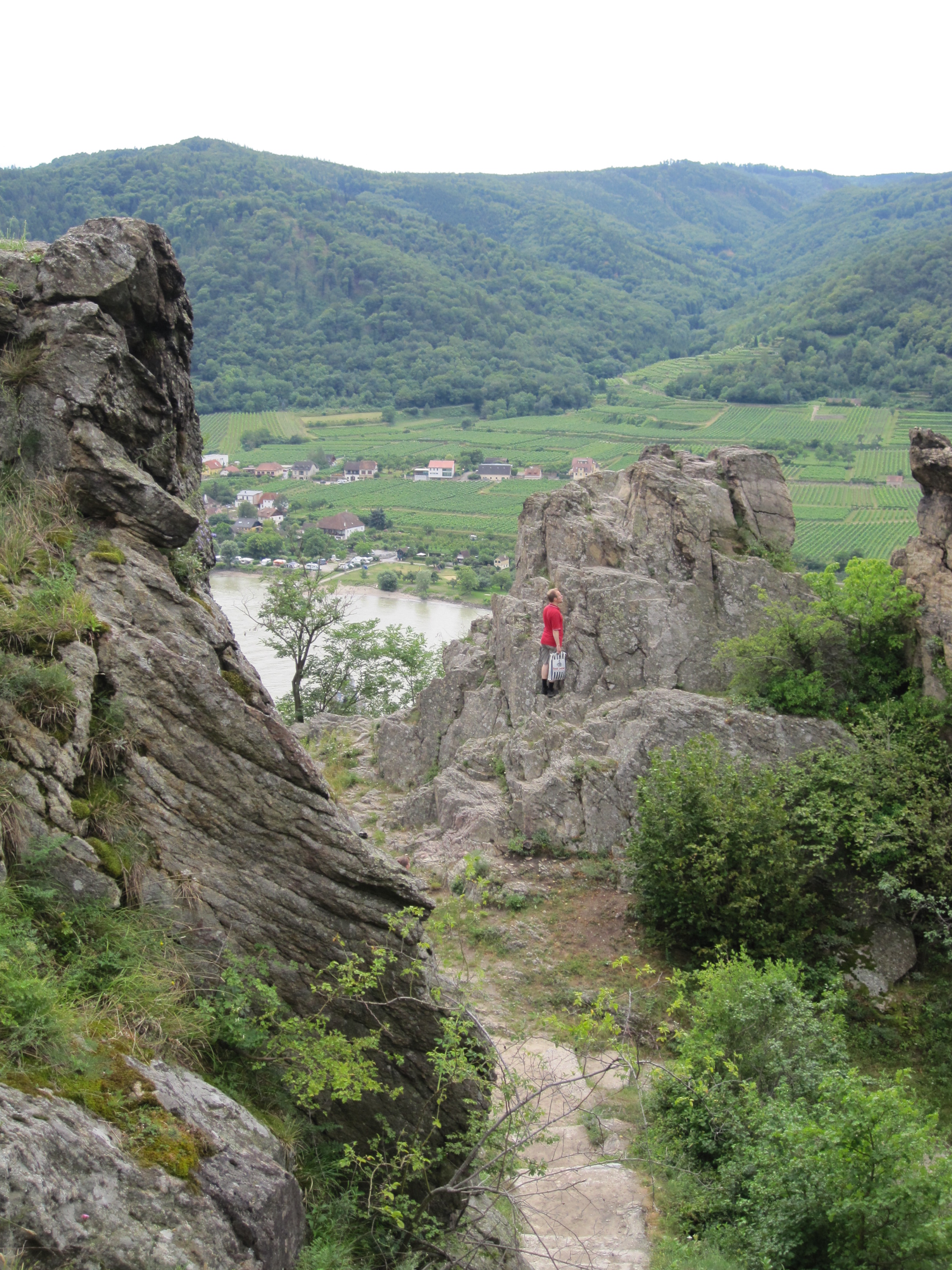 Da es inzwischen regnet, wählen wir den Steig, der direkt zur Burgruine Dürnstein abfällt, und gehen nicht auf die Starhembergwarte. In 45 Minuten kommen wir zur berühmten Burgruine Dürnstein mit schönen Blicken auf die Wachau und auf die bizarren Felsformationen. Die Burg Dürnstein diente im 12. Jahrhundert als Gefängnis von König Richard Löwenherz.