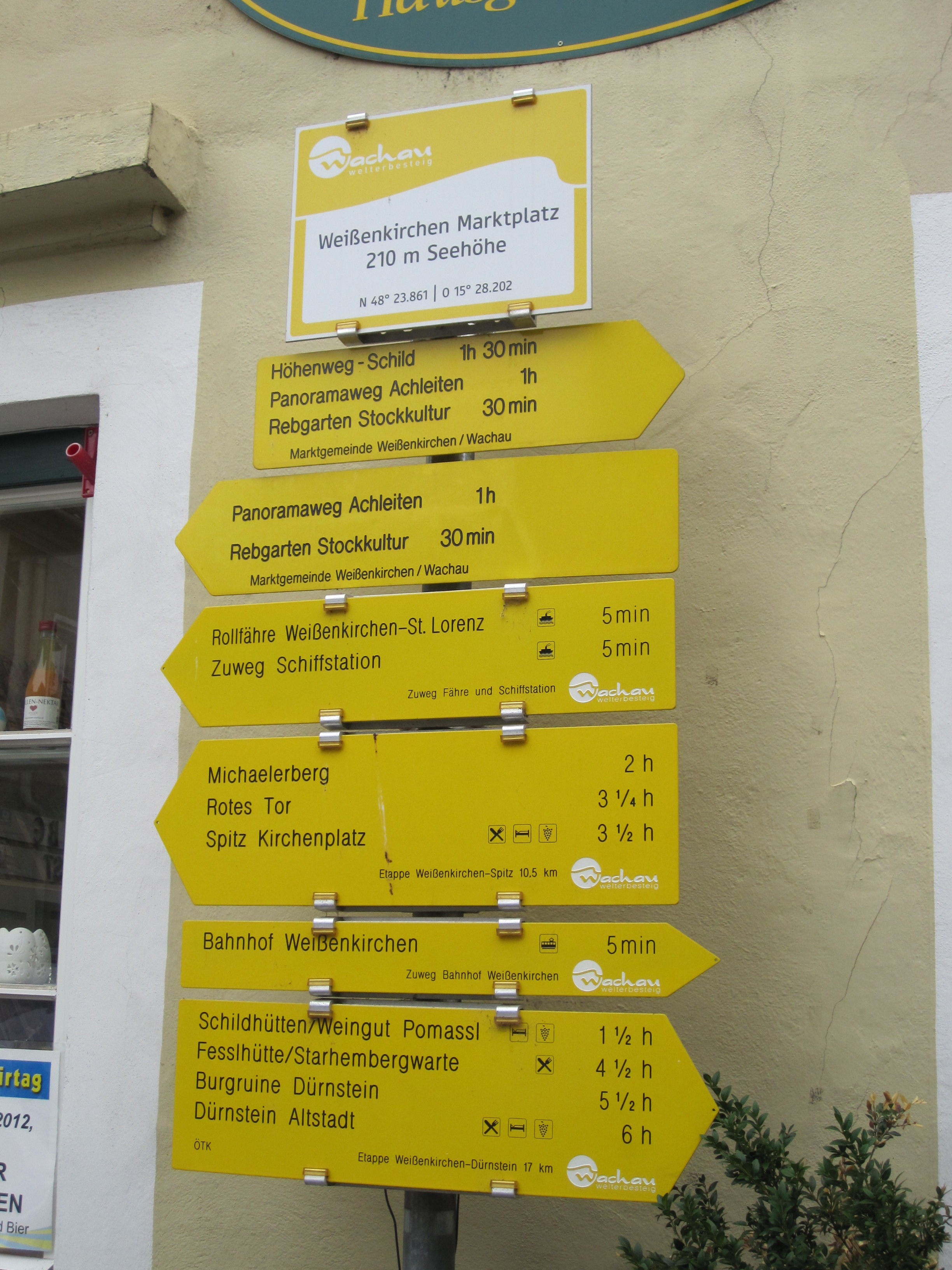 Ganz leicht ist es nicht aus dem Ort Weissenkirchen herauszufinden und die richtige Richtung auf dem Welterbesteig einzuschlagen. Grundsätzlich ist der Weg sehr gut beschildert, ein paar Schilder mehr könnten es in Weissenkirchen aber sein. Wir gehen auf Anraten der Einheimischen in Richtung Wehrkirche und dann an der ältesten noch in Betrieb stehenden Volkschule linkerhand vorbei. Und dann nicht aufgeben, irgendwann kommt wieder ein Schild!