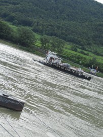 Wir nehmen die Rollfähre von Spitz um an die andere Donauseite zu gelangen (€1,20 pP). Vom andern Donauufer haben wir einen schönen Blick auf die Spitzer Kirche, den Tauseneimerberg und die Ruine Hinterhaus.