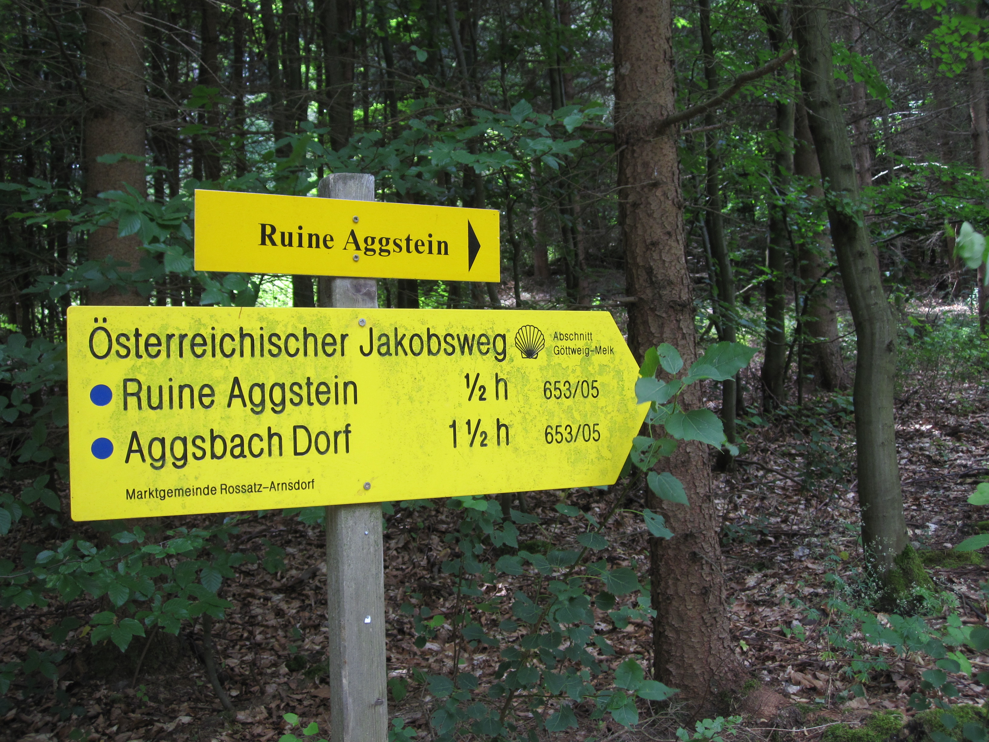 Wir gehen nun im Dunkelsteiner Wald in Richtung Kloster Maria Langegg, das wir aber auf dem Europäischen Weitwanderweg 05 „umgehen“. Etwa 400 Meter nach dem Marterl biegen wir rechts auf den wenig begangenen 05-er ab und marschieren bergab. Nach ca. 1 km gesellt sich der Welterbesteig wieder hinzu. Wir bleiben fortan auf dem 05-er, der auch Jakobsweg nach Melk ist.